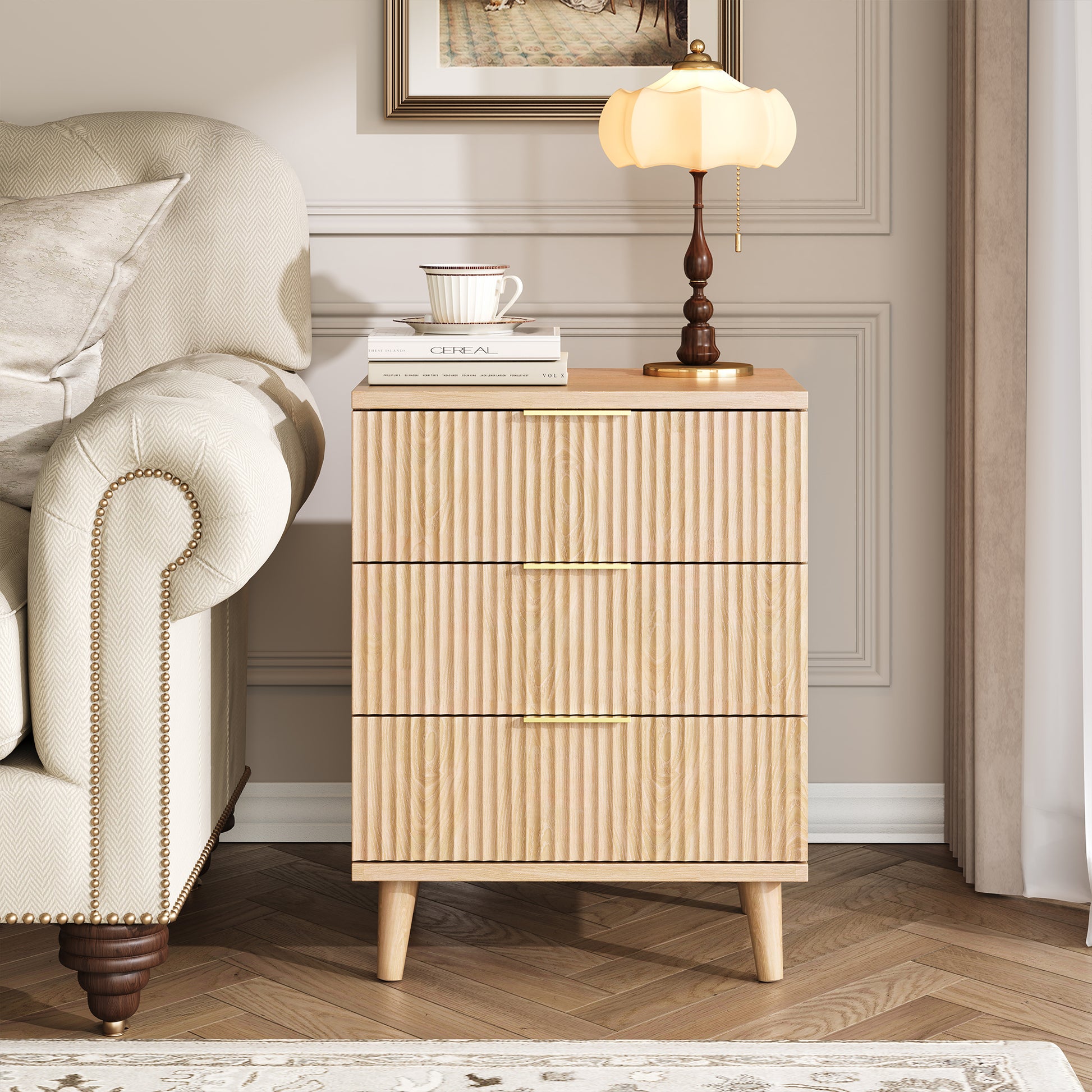 Fluted Nightstand with USB Charging Station, 3 Drawer Dresser Wood Modern Night Stand Bedside Table with Quiet Drawers & Large Storage End Table for Bedroom (1pcs, Natual)