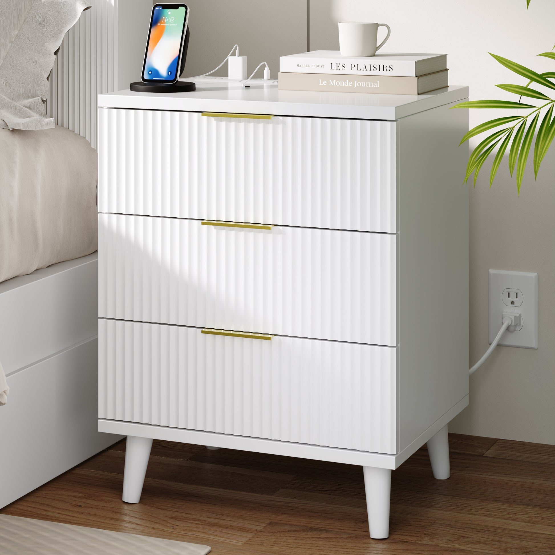 Fluted White Nightstand with USB Charging Station, 3-Drawer Dresser Wood Modern Night Stand Bedside Table with Quiet Drawers & Large Storage End Table for Bedroom
